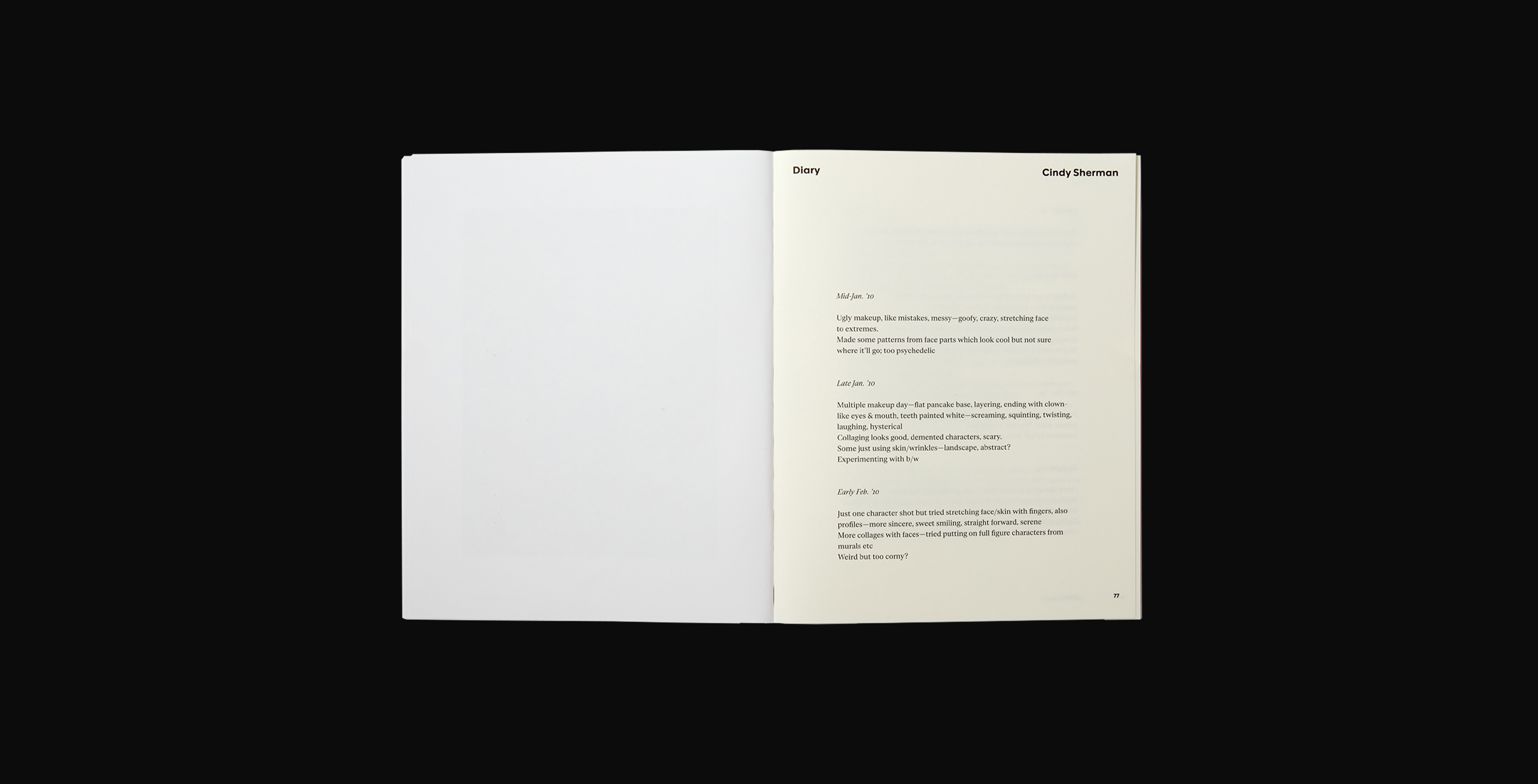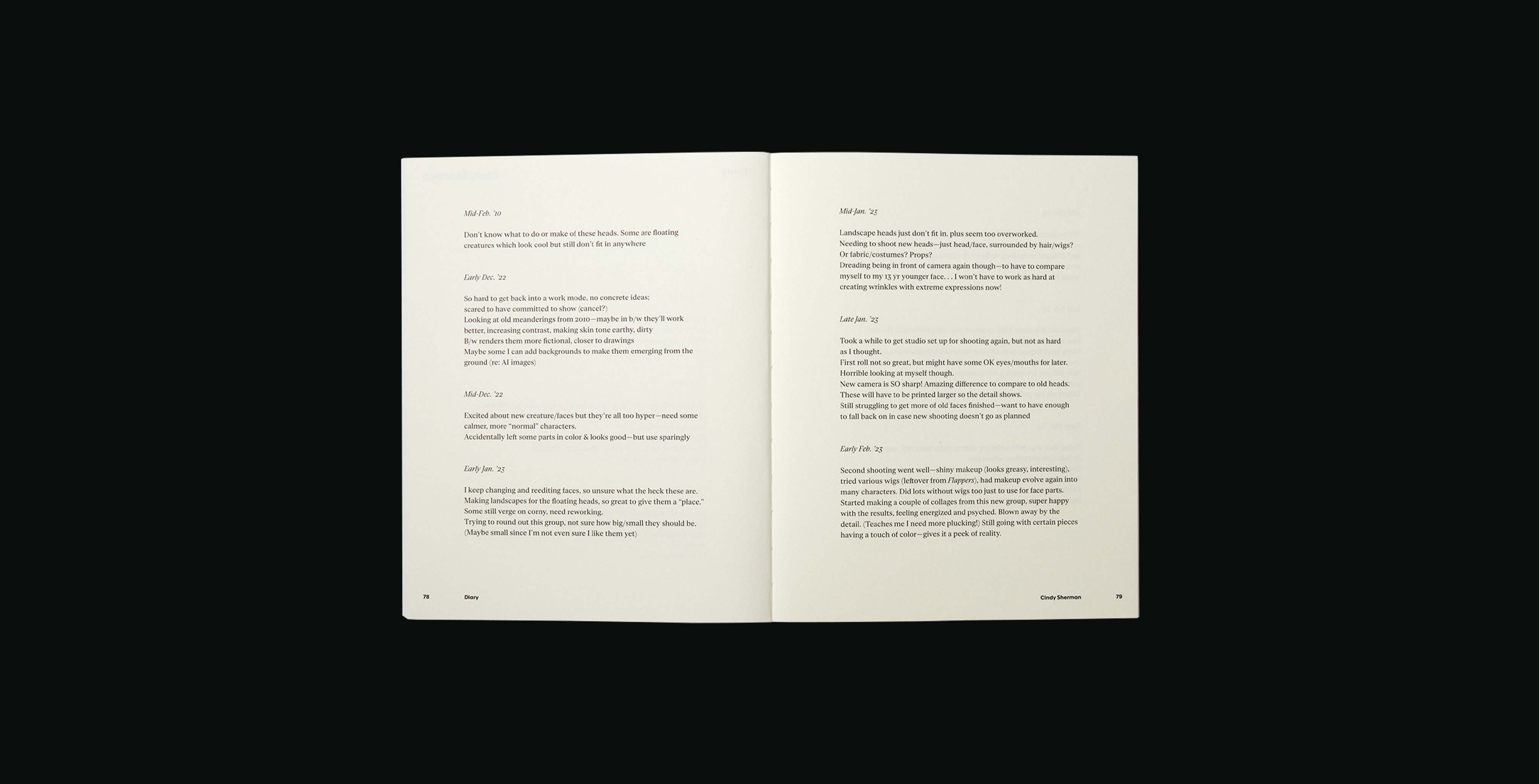 Sales copy: This publication presents a new body of work by Cindy Sherman that continues her explorations of the genre of portraiture going back to her early work of the 1970s. Across thirty-six photographs, the artist collages parts of her own face to construct the identities of various sitters, using digital manipulation to accent the layered aspects and plasticity of the self. The book also includes a text by Sherman chronicling her process in the studio, offering an intimate glimpse into her thinking about the work.